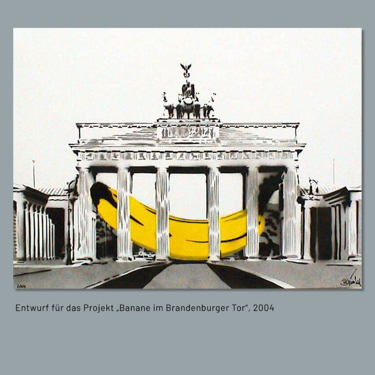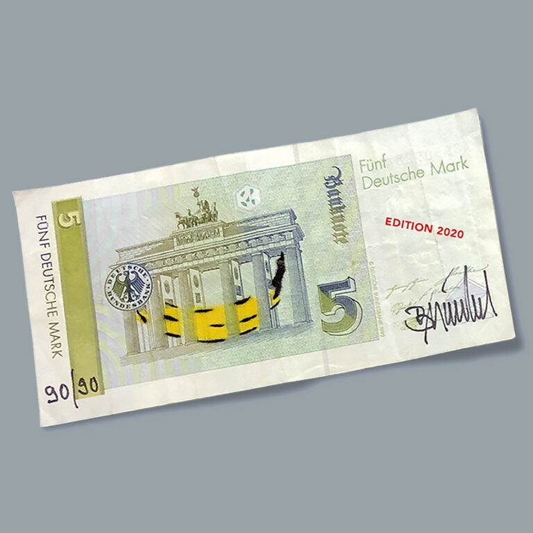 30 years after the “German Reunion” the D-Mark is back! After Thomas Baumgärtel’s first banana pochoir at the the 5-DM note adopted in 2002, the 2020 edition got released 18 years later. The banknote shows the Brandenburg Gate of Berlin with “built-in” Musa of the “Bananensprayer” as stencil graffiti on the back of original banknotes printed in 1991 with Bettina von Arnim’s portrait on the front. The copy price of 155 Euro is used to pre-finance or co-finance the realisation of Baumgärtel’s project “Banana in the Brandenburg Gate” for the euro cash anniversary 2022.