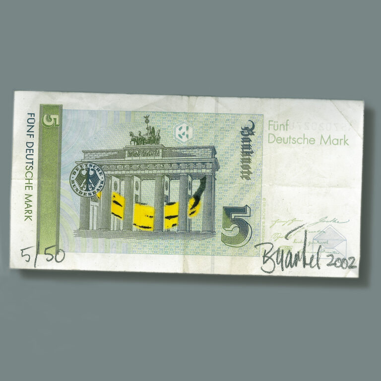 Artistic Recycling in the year the Euro was introduced as currency: Discarded bills serve as a medium of this Stencil-Graffiti-Edition. On the 5 German Mark banknotes shows the Brandenburg Gate of Berlin with the “built-in” fruit of the “Banana Sprayer”.
