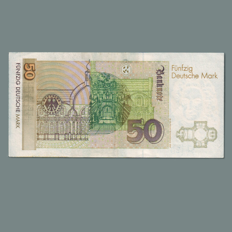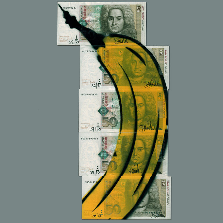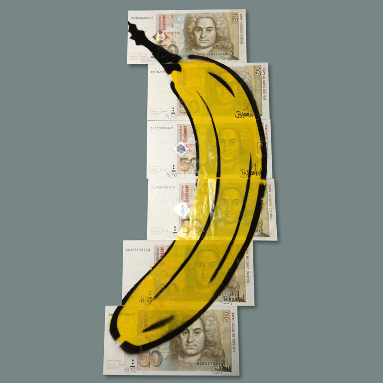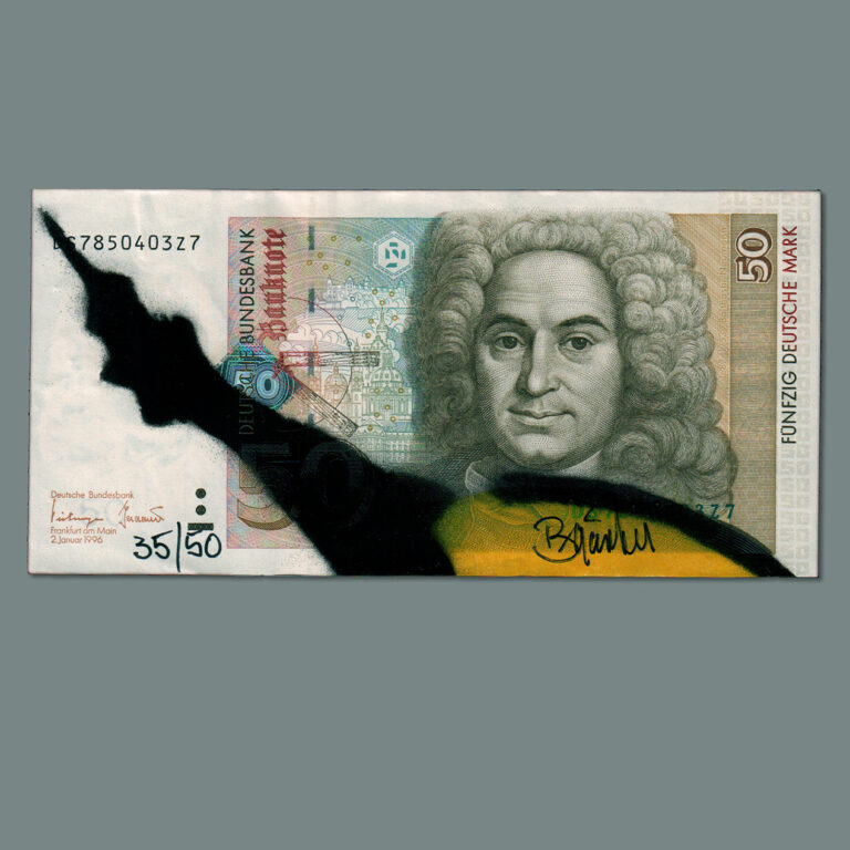 Artistic Recycling in the year the Euro was introduced as currency: Discarded bills serve as a medium of this Stencil-Graffiti-Edition. On the 50 German Mark banknotes appears the portrait of the baroque architect Balthasar Neumann, colored in banana yellow.