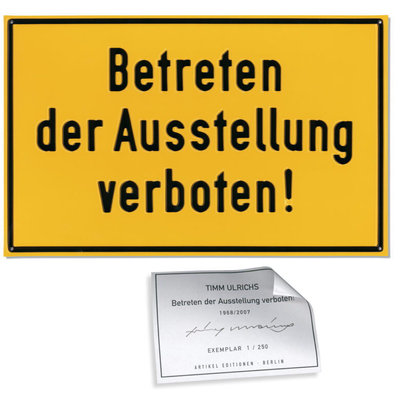 In den 1960er Jahren plädiert Timm Ulrichs dafür, die Kunst aus den Kunsträumen heraushalten und statuiert ein Exempel: Eingeladen zu einer Personale, macht er den Ausstellungsraum mit Desinfektionsmitteln keimfrei, legt Rattengift aus und versiegelt die Galerie. An der versperrten Eingangstür hängt das Plakat „Betreten der Ausstellung verboten!“ (Kabinett für aktuelle Kunst, Bremerhaven 1970). 1969 gibt es einen Prototyp des Schildes (Sprengel Museum, Hannover). 2007 kommt die große limitierte Sammlerausgabe heraus, gefolgt von der postkartengroßen Variante für Museumsshops. Timm Ulrichs’ Vorschlag, Kunst aus der Klausur der „keimfreien“ White Cubes der Galerien und Museen zu befreien, ist damit aktuell bekräftigt. Siehe auch: Shop-Edition