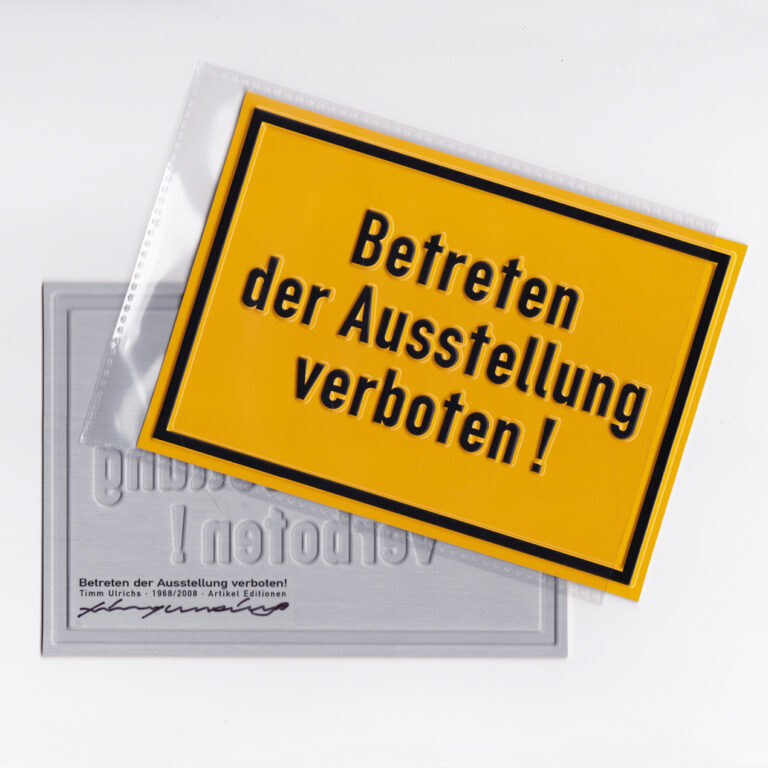 In den 1960er Jahren plädiert Timm Ulrichs dafür, die Kunst aus den Kunsträumen heraushalten und statuiert ein Exempel: Eingeladen zu einer Personale, macht er den Ausstellungsraum mit Desinfektionsmitteln keimfrei, legt Rattengift aus und versiegelt die Galerie. An der versperrten Eingangstür hängt das Plakat „Betreten der Ausstellung verboten!“ (Kabinett für aktuelle Kunst, Bremerhaven 1970). 1969 gibt es einen Prototyp des Schildes (Sprengel Museum, Hannover). 2007 kommt die große limitierte Sammlerausgabe heraus, gefolgt von der postkartengroßen Variante für Museumsshops. Timm Ulrichs’ Vorschlag, Kunst aus der Klausur der „keimfreien“ White Cubes der Galerien und Museen zu befreien, ist damit aktuell bekräftigt.