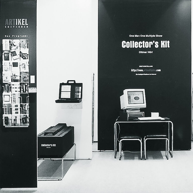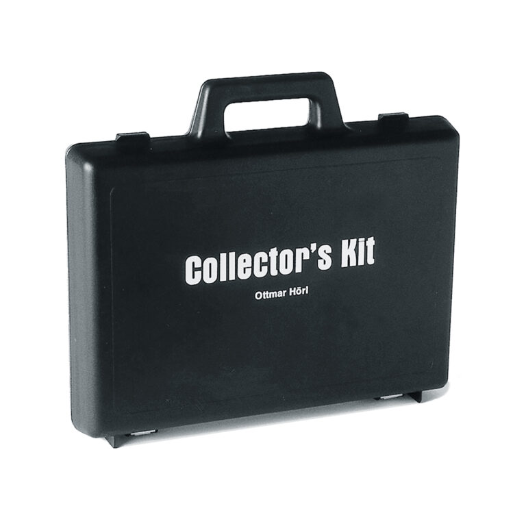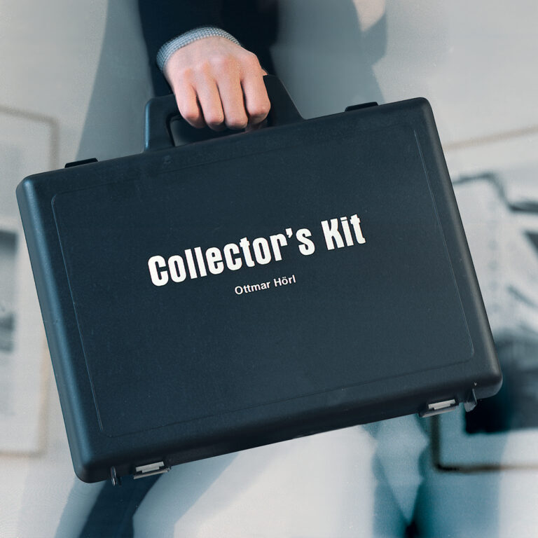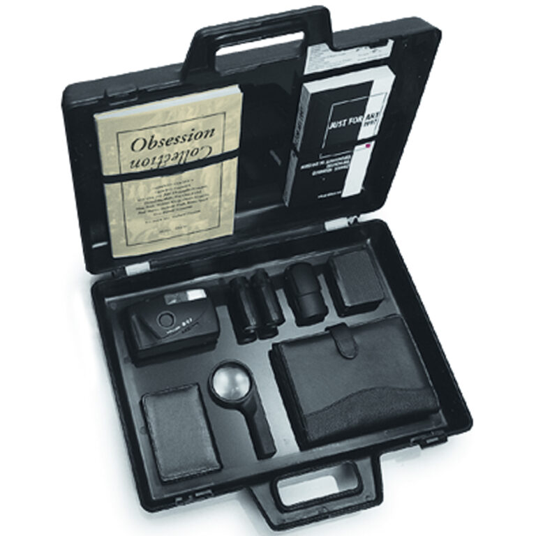 Kofferinhalt: Fernglas, Lupe, Taschenlampe, Fotokamera, Maßband, Rechnermappe mit Kugelschreiber, Visiten- oder Kreditkartenetui, Buch Obsession Collection, G. Theewen, Just for Art 1997 (Kunstadressen Deutschland, Österreich, Schweiz).
