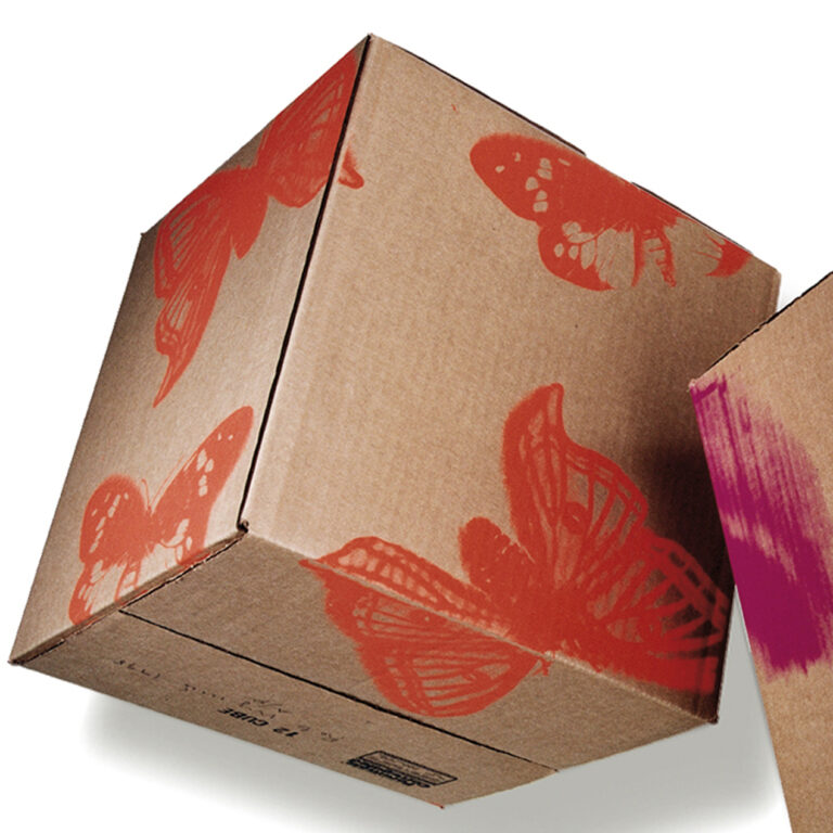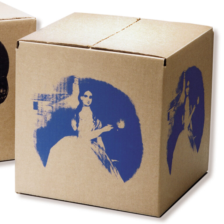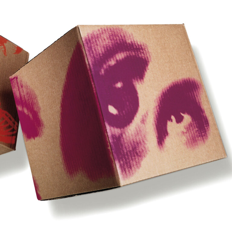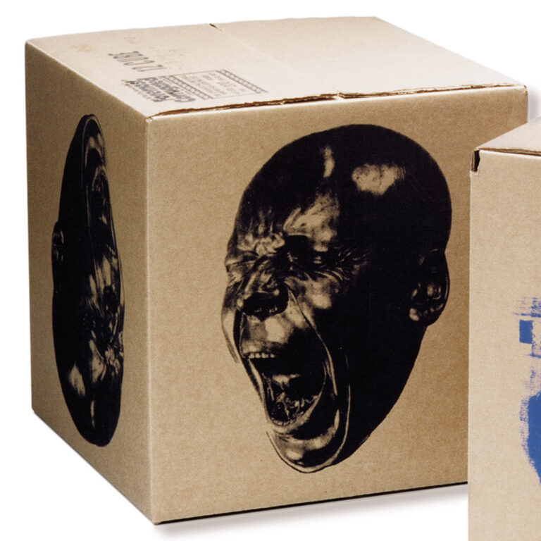 Silkscreen prints on 12 inch US-american cardboard boxes, with four of the artist`s motifs made famous in large installations. Among them, “Sleepwalker”, after an early Bellini opera poster and “Messerschmidt” as in Franz Xaver Messerschmidt, who in the 18th century cast heads from Laverter`s dubious phrenological studies into bronze.