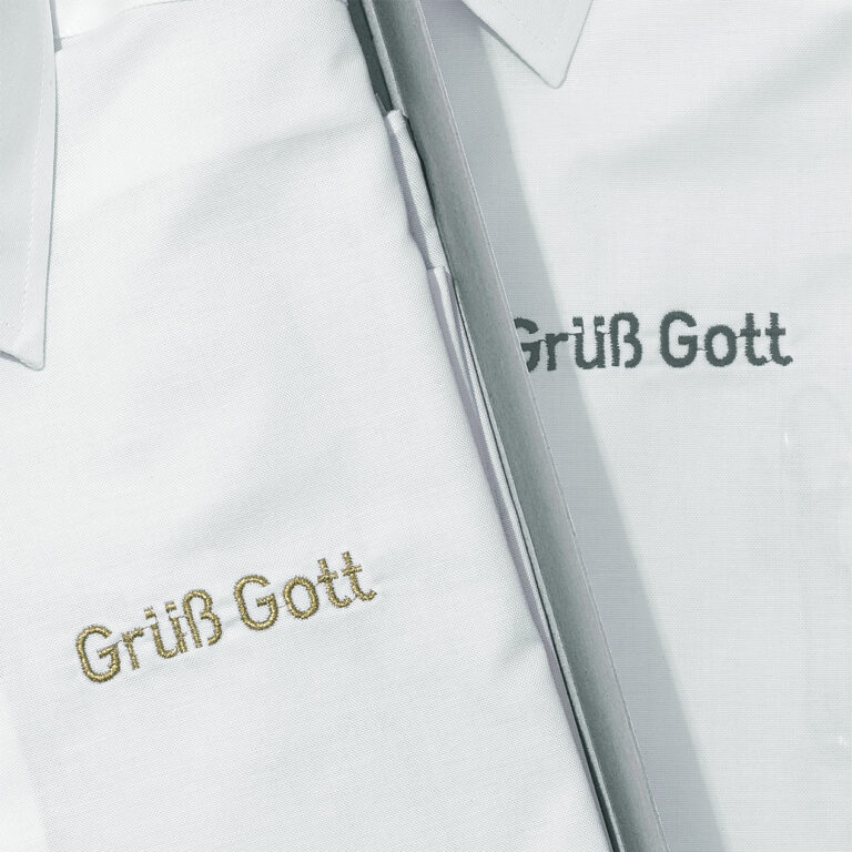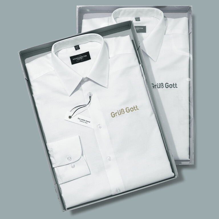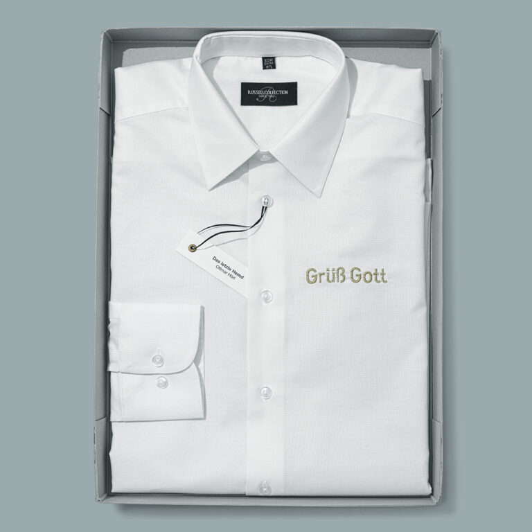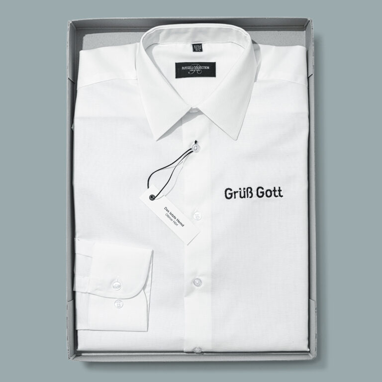 White men’s shirt embroidered gold/black „Grüß Gott!“ (Hello [God]) Box 45 x 33 x 5 cm 1/35–35/35 · sign./num.