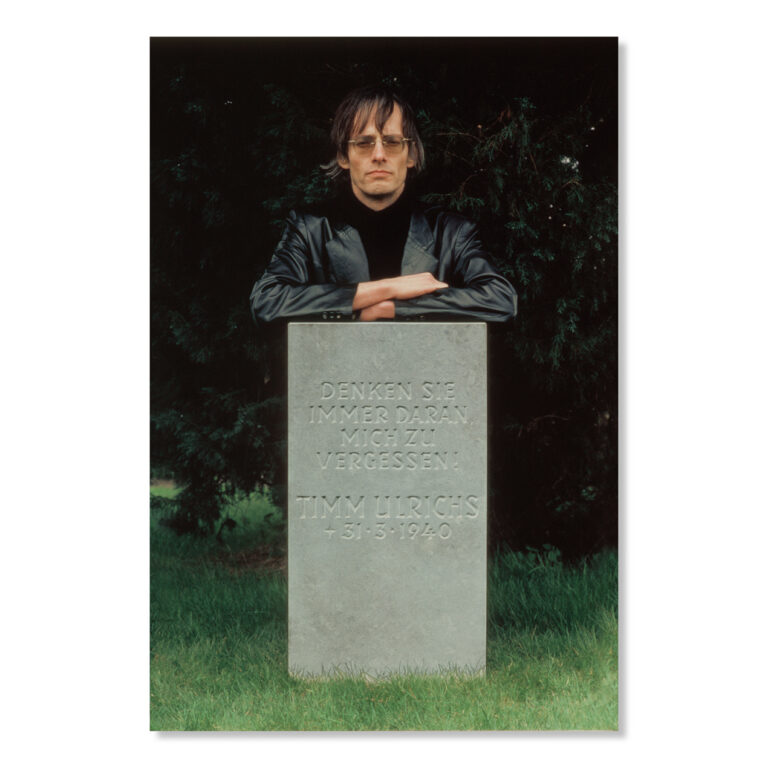 Der Mementomori-Spruch-Brosche steckt auf einer Widmungskarte, die Timm Ulrichs an seinem Grabstein zeigt – 1985 für eine Titelseite des »Zeit-Magazins« fotografiert von Dirk Reinarts. Angesichts der „Grabmale für den unbekannten Soldaten“ reklamiert Timm Ulrichs gleiches Recht für den „unbekannten, unerkannten, verkannten oder totgeschwiegenen Künstler“ und macht 1969 als junger Kollege den Anfang. Bei der Formulierung des Grabspruches folgt er dem Rat des Mailänder Futuristen Aldo Palazzeschi, „Grabschriften zu diktieren, die auf Wortspielen, Kalauern und Doppeldeutigkeiten beruhen“ (1913) und diktiert einem Steinmetz die Antinomie: „Denken Sie immer daran, mich zu vergessen! / Timm Ulrichs * 31. 3. 1940“, schafft dazu ein gleich lautendes Amulett (1972).