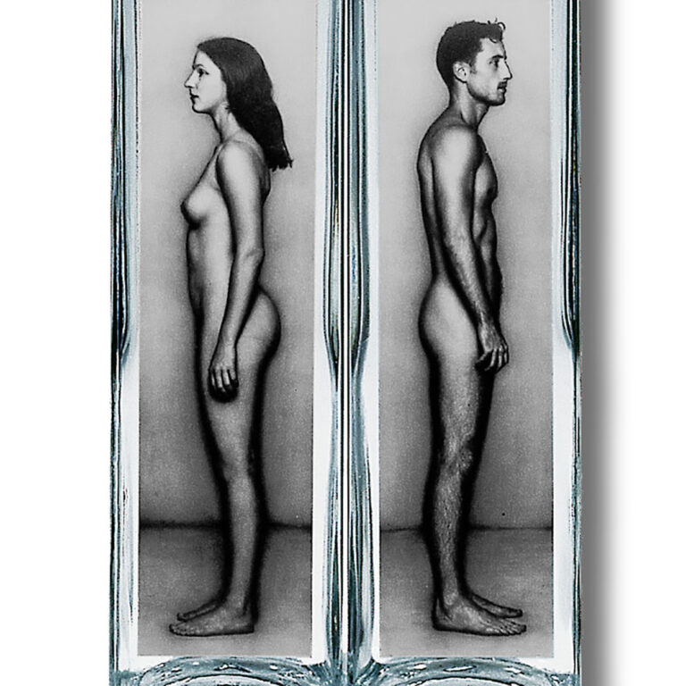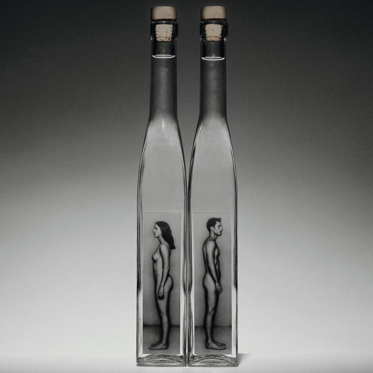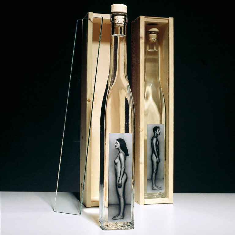 2 Aktfotos als Schwarz-Weiß-Handabzüge auf Sibergelatine-Barytpapier, aufgezogen jeweils auf die Fläche einer quadratischen Grappa-Flasche. Inhalt: je 0,5 Liter Grappa di Cartizze (Motiv „Adam“) und Grappa di Sauvignon (Motiv „Adam“) aus Treviso in Geschenkboxen aus Holz mit Plexiglasschuber und Editionsfibel. Limitiert auf 125 Exemplare pro Paar, nummeriert und handsigniert.