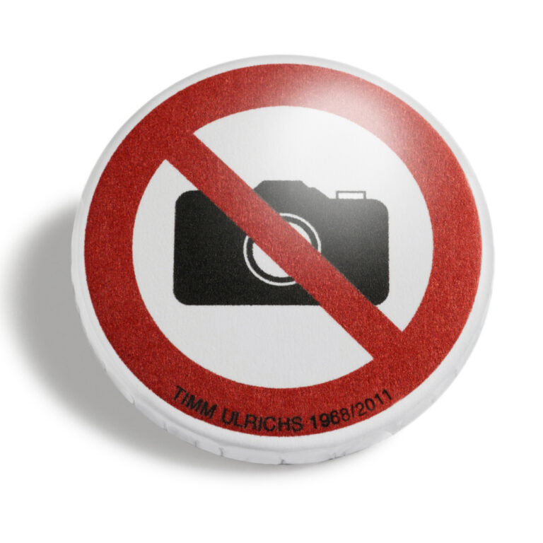 ”Photography Prohibited!“ it has said everywhere since travel with a camera began – and it persists up to our present camera phone-Facebook age. Timm Ulrichs takes ad absurdam the sign banning photography in exhibition spaces and public places by having the signs themselves photographed. Sixty of these photographs, taken on four continents between 1968 to 2011, are in his book ”Photography Prohibited!“. The pictogram is available separately as a sticker.