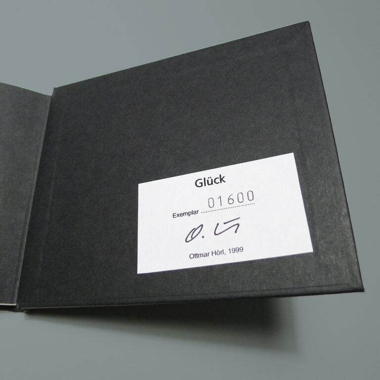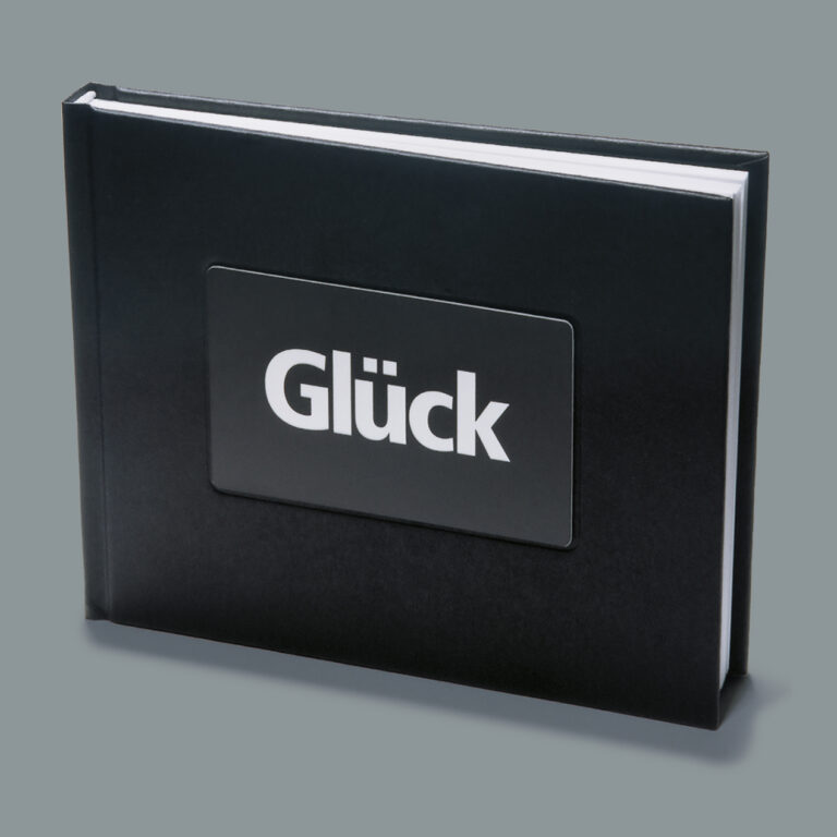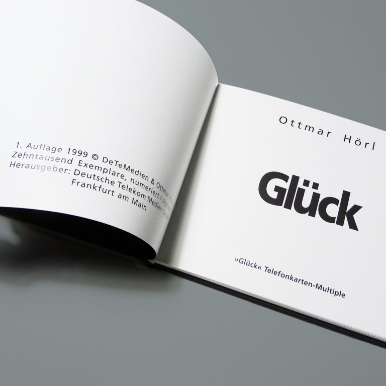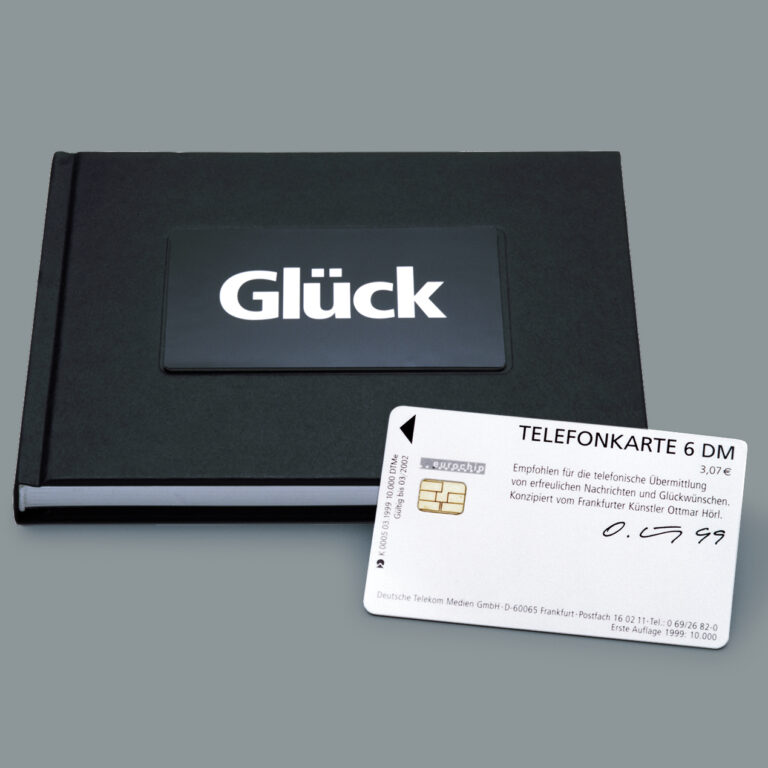 In 1999 Ottmar Hörl was invited by DeTeMedien (Deutsche Telekom Medien) to design a telephone card. Introduced in 1990, the card had just reached the 500 million mark and its end was foreseeable due to the spread of mobile phones. Hörl made a virtue of the situation and turned the phone card into a talisman. He answered the question of what everyone could use by writing “Glück” (luck) on it and recommended his card with the 6-DM credit chip “for the telephone transmission of pleasant news and congratulations”. Hörl’s “Glück” card was published in conjunction with an anthology on the subject of luck and in business card cases such as the miniature aluminium suitcase. DeTeMedien art edition was distributed at Art Frankfurt 1999 and subsequently through museum shops.