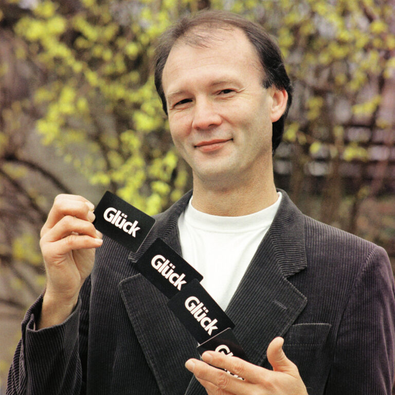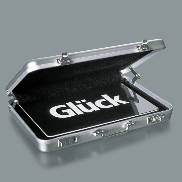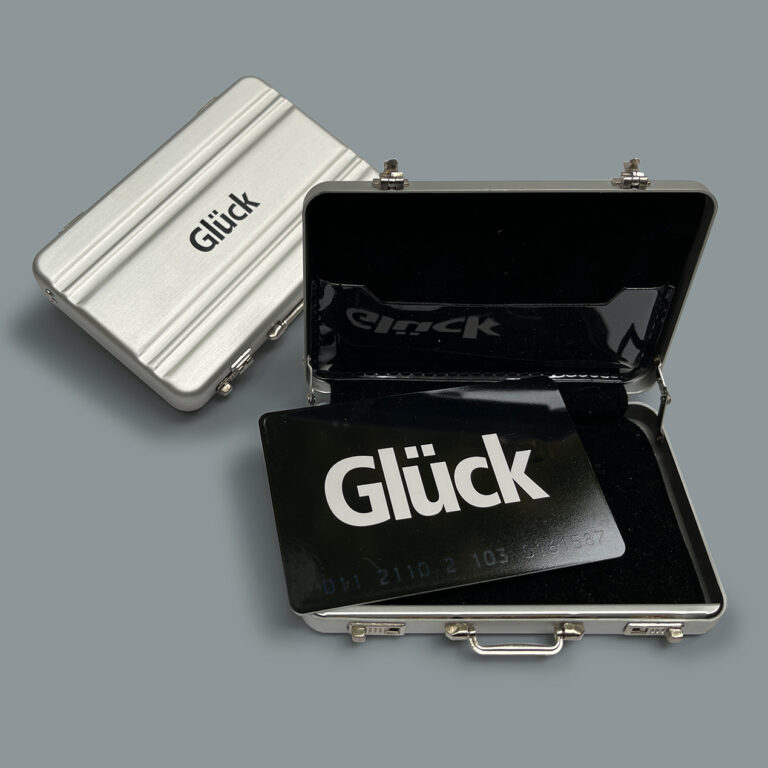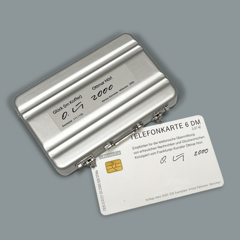 In 1999 Ottmar Hörl was invited by DeTeMedien (Deutsche Telekom Medien) to design a telephone card. Introduced in 1990, the card had just reached the 500 million mark and its end was foreseeable due to the spread of mobile phones. Hörl made a virtue of the situation and turned the phone card into a talisman. He answered the question of what everyone could use by writing “Glück” (luck) on it and recommended his card with the 6 DM credit chip “for the telephone transmission of pleasant news and congratulations”. Hörl’s “Glück” card was published in conjunction with an anthology on the subject of luck and in business card cases such as the miniature aluminium suitcase. DeTeMedien art edition was distributed at Art Frankfurt 1999 and subsequently through museum shops.