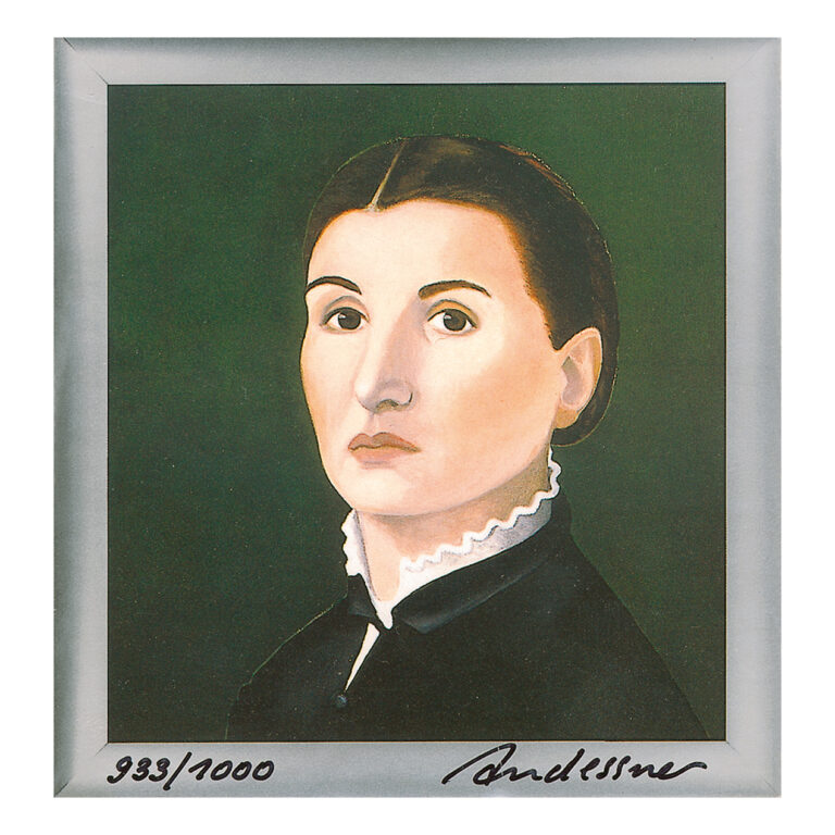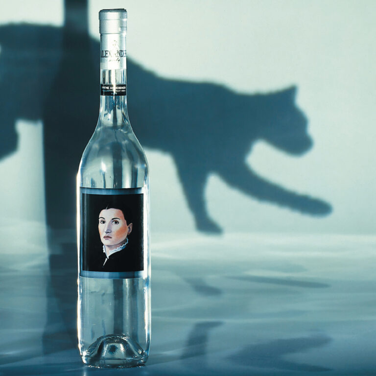 Erste Edition in der Reihe „Grappa Portrait Gallery“ – Kunstgalerie auf Grappaflaschen – mit zwei Motiven von Irene Andessner: „Selbstportrait 1554“ nach Sofonisba Anguissola-Selbstporträt; „Benjamin“ Katzenporträt. Reproduktionen nach Öl-auf-Leinwand-Originalen im Sechs-Farben-Offsetdruck, 120er Raster, auf Folie.
