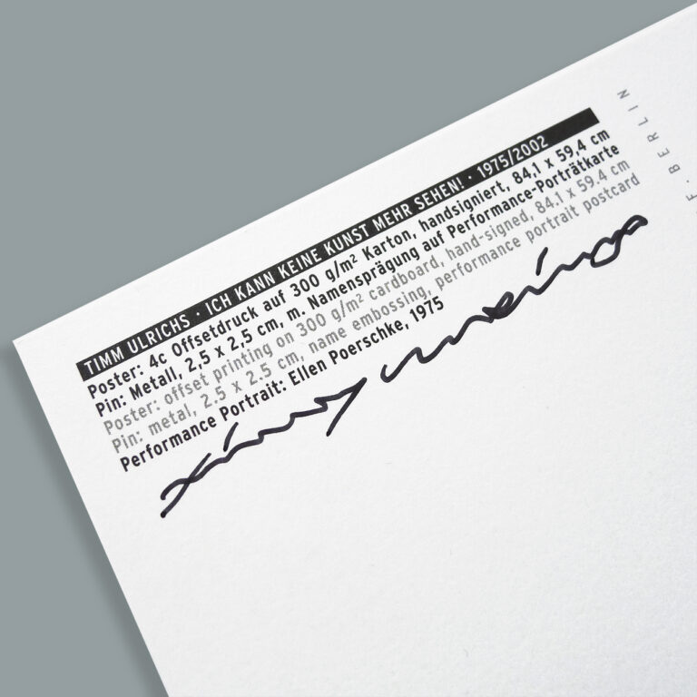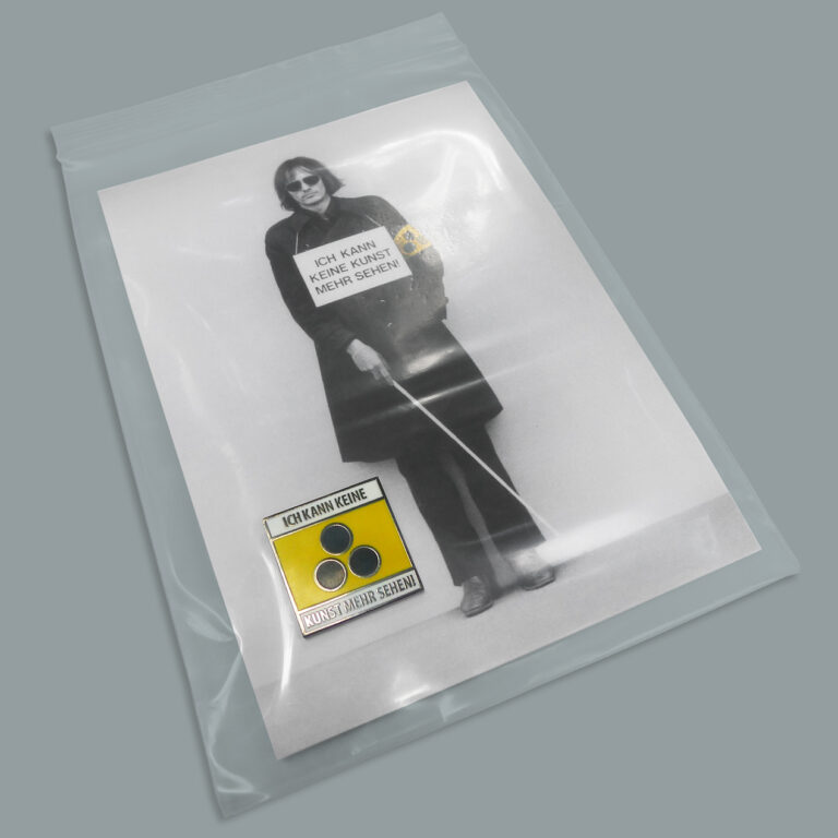 1975 ging Timm Ulrichs – als junger Kunstprofessor aus Münster – mit Blindenbrille, weißem Stock und gelber Armbinde sowie mit dem Brustschild „Ich kann keine Kunst mehr sehen!“ über die Kölner Kunstmesse (Art Cologne). Fotografiert von Ellen Poerschke, ist das Performance-Motiv im Jahr 2002 als Künstlerplakat erschienen – jedes Exemplar handsigniert. An die Performance erinnert auch der Email-Pin „Ich kann keine Kunst mehr sehen!”, ausgestattet mit dem Bildmotiv auf Karte in einer Plastiktüte.
