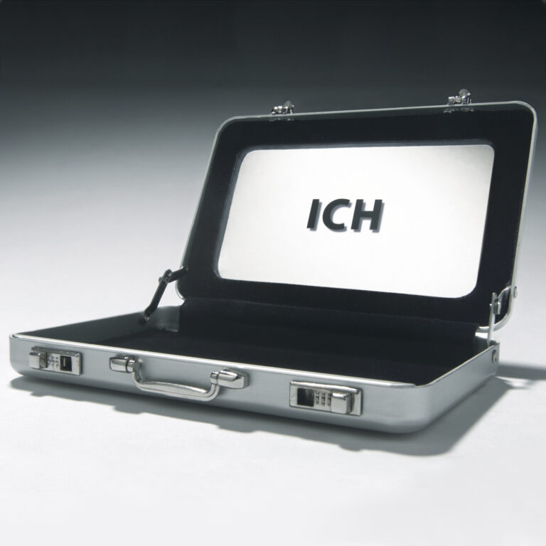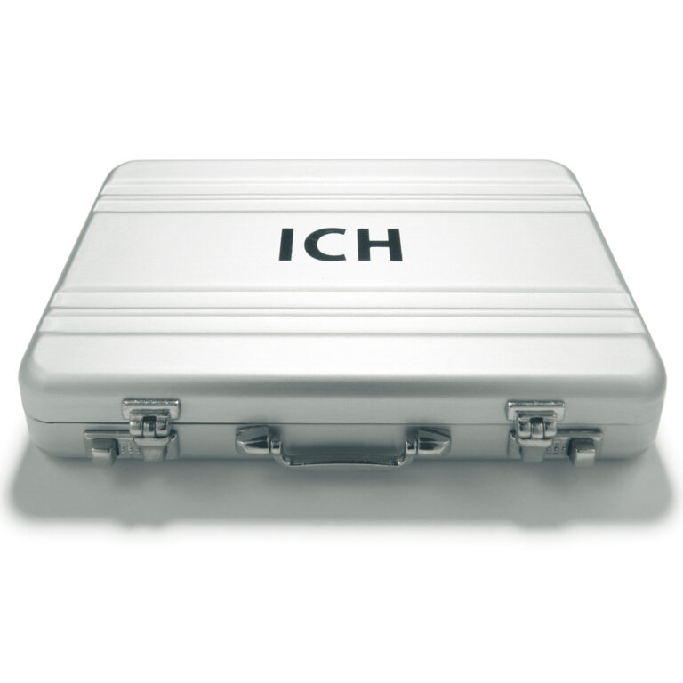 “Io, Michelangelo Buonarroti” – with the awakening of personal self-understanding among visual artists in the Renaissance, their works bear a kind of ego stamp. Art is linked to self-being, especially in self-aware self-portraits, later – from the early 1960s – identified with the display of one’s own person, or reduced to “I” type faces. With the ME pocket mirror, Ottmar Hörl has verbally and formally concretised this I-identification for everyone in the form of a nostalgic pocket mirror, and in a variation on the business card and credit card holder as a miniature aluminium attaché case with snap locks.