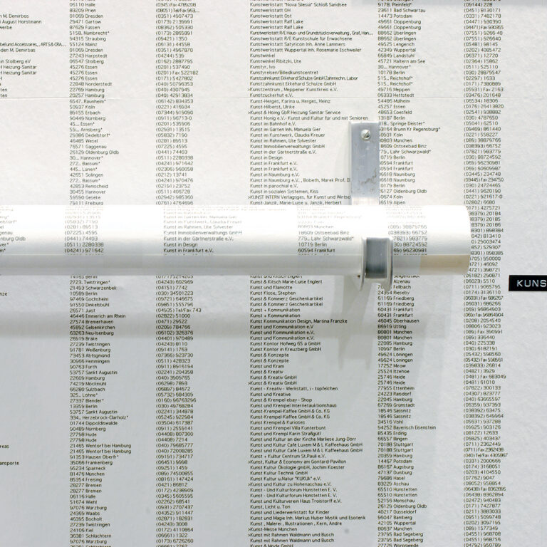 Aus der Werkgruppe „Im Namen der Kunst“. In diesem Projekt stellt Andreas Paeslack die Frage: Was wird im Namen der Kunst in die Welt gesetzt? Er thematisiert die paradoxe Gegebenheit, dass sich die unterschiedlichsten (Produktions-/Markt-)Bereiche und Kunstrichtungen einen Namen teilen, sich aber kaum um abgrenzende, eigenständige Begriffsbestimmungen bemühen — auch nicht innerhalb der zeitgenössischen Kunst, die wiederum in sich selbst heterogene Bereiche und inhaltlich/formal/konzeptionell gegeneinander stehende Positionen unter einer Kennzeichnung versammeln.