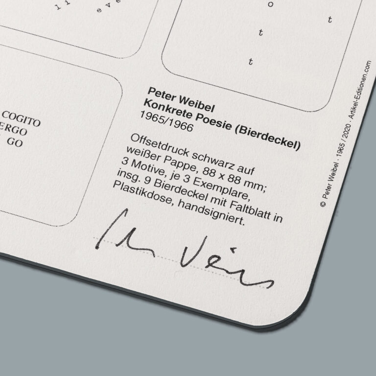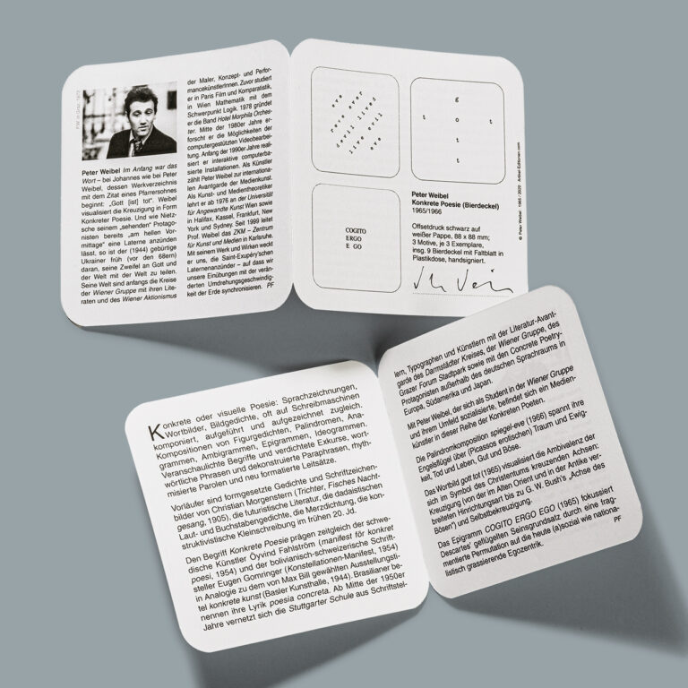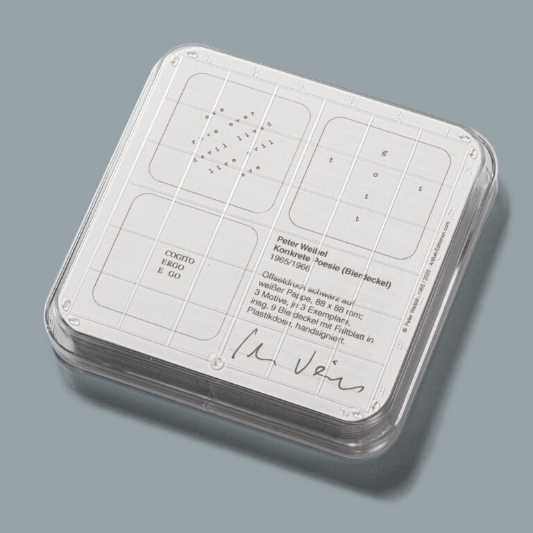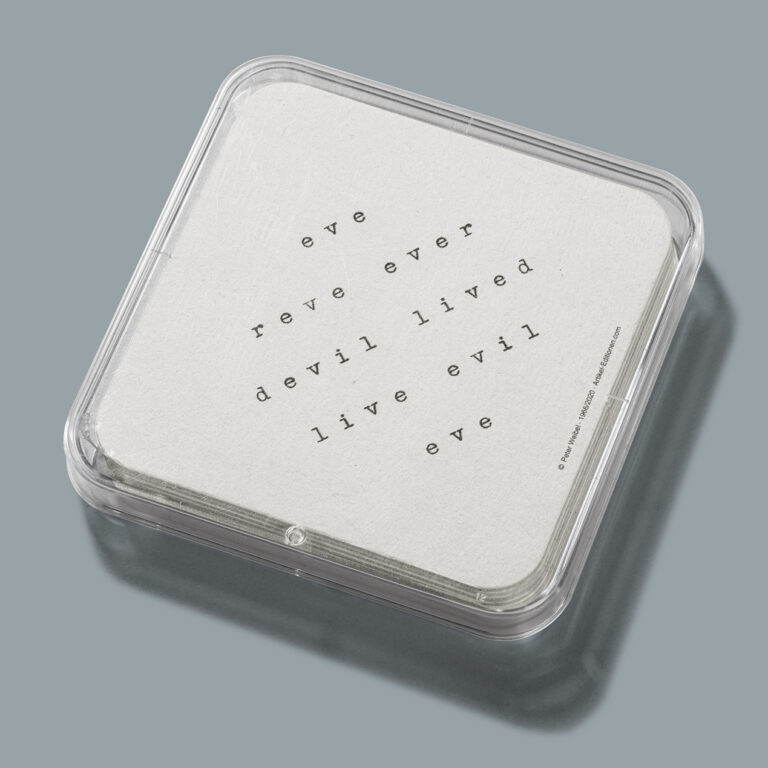 Die Palindromkomposition „spiegel-eve“ (1966) spannt ihre Engelsflügel über (Picassos erotischen) Traum und Ewigkeit, Tod und Leben, Gut und Böse. Das Wortbild „gott tot“ (1965) visualisiert die Ambivalenz der sich im Symbol des Christentums kreuzenden Achsen: Kreuzigung (von der im Alten Orient und in der Antike verbreiteten Hinrichtungsart bis zu G. W. Bush’s „Achse des Bösen“) und Selbstbekreuzigung. Das Epigramm „COGITO ERGO EGO“ (1965) fokussiert Descartes’ geflügelten Seinsgrundsatz durch eine fragmentierte Permutation auf die heute (a)sozial wie nationalistisch grassierende Egozentrik.