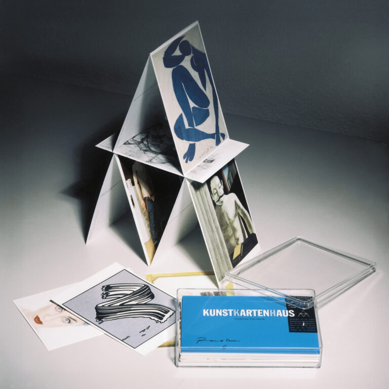 Mit seinem Kartenspiel „Kunstkartenhaus“ ruft Andreas Paeslack dazu auf, die Standfestigkeit der Kunstströmungen des 20. Jahrhunderts zu überprüfen. Als Bausteine dienen 50 Kunstpostkarten aus dem Gebr. König Verlag – also Abbildungen approbierter Werke (von Pablo Picasso bis Pipilotti Rist), editiert mit einem Text zur Kunstentwicklung von Achim Preiß, dem Kurator der umstrittenen Weimarer Ausstellung „Aufstieg und Fall der Moderne“.