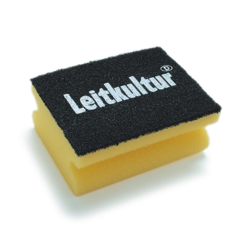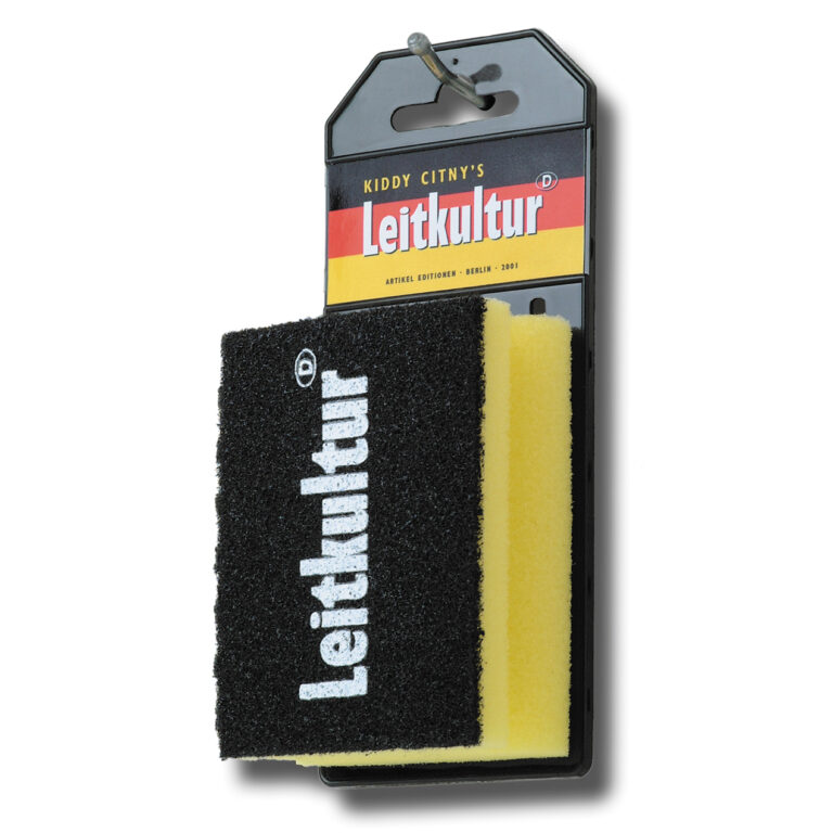 „Leitkultur“ fand sich im Jahr 2000 unter den Top-ten der (von der Gesellschaft für deutsche Sprache ermittelten) Wörter des Jahres (Platz 8). Auf der schwarzen Reibefläche weiß gedruckt, löst sich das vielfach strapazierte und abgenutzte (Un)Wort beim Saubermachen auf. Alternativ läßt sich die „Leitkultur“ auf der Lochplatte einfach an den Nagel hängen.