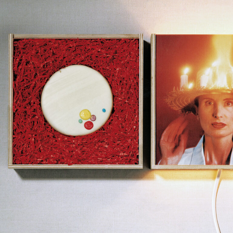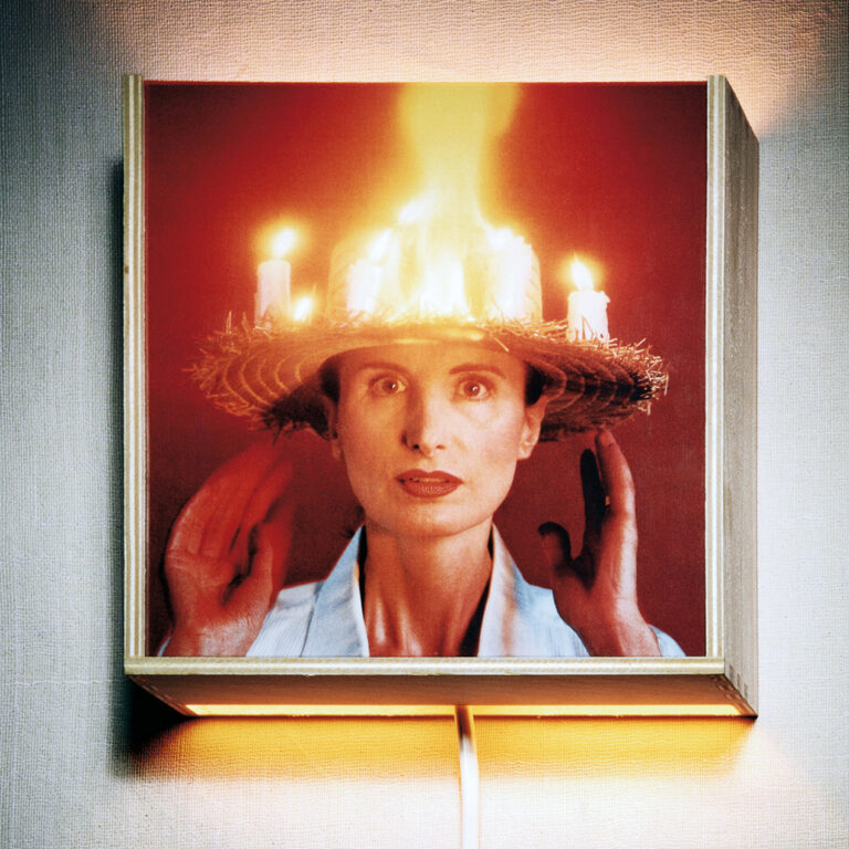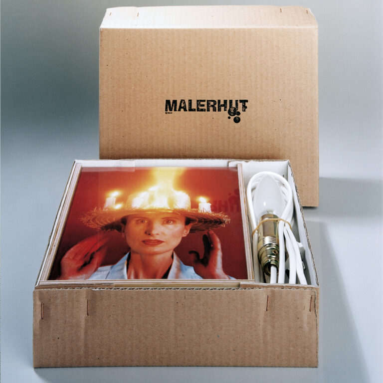 Goya vor 200 Jahren: „Selbstporträt in der Werkstatt“. Der Mann trägt Hut, die Krempe mit Kerzen besetzt, um nachts an der Staffelei arbeiten zu können. Weil manche Maler dazu ihren Strohhut nahmen (wie von Kirk Douglas im Van Gogh-Film 1956 vorgeführt), fing der Hut gelegentlich Feuer. Diesen Fall hat Irene Andessner nachinszeniert.