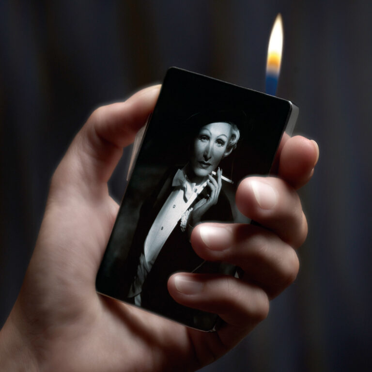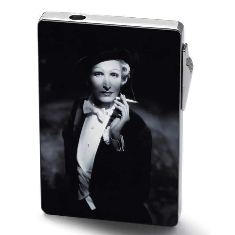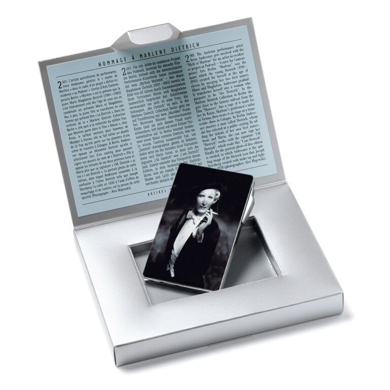 Irene Andessner has perfectly re-staged Joseph Sternberg’s Dietrich “Morocco” portrait of 1930. The role portrait was reproduced from an 8 x 10” Polaroid. The lighter is in a silver cardboard gift box with the hand signed portrait on the cover. The overall project “I. M. Dietrich” is explained in the inner cover in French, German and English.