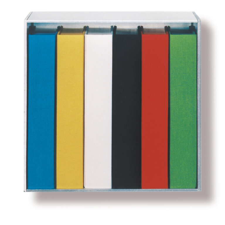 Dieses Wand-Stilleben besteht aus sechs Blindbänden (das sind gebundene Bücher mit unbedruckten Seiten), jeweils in einer Farbe (blau, gelb, weiß, schwarz, rot, grün) durchgefärbt von der ersten bis zur letzten Seite, der Titel „monochroms/hörl“ auf dem Coverdeckel in Blindprägung.
