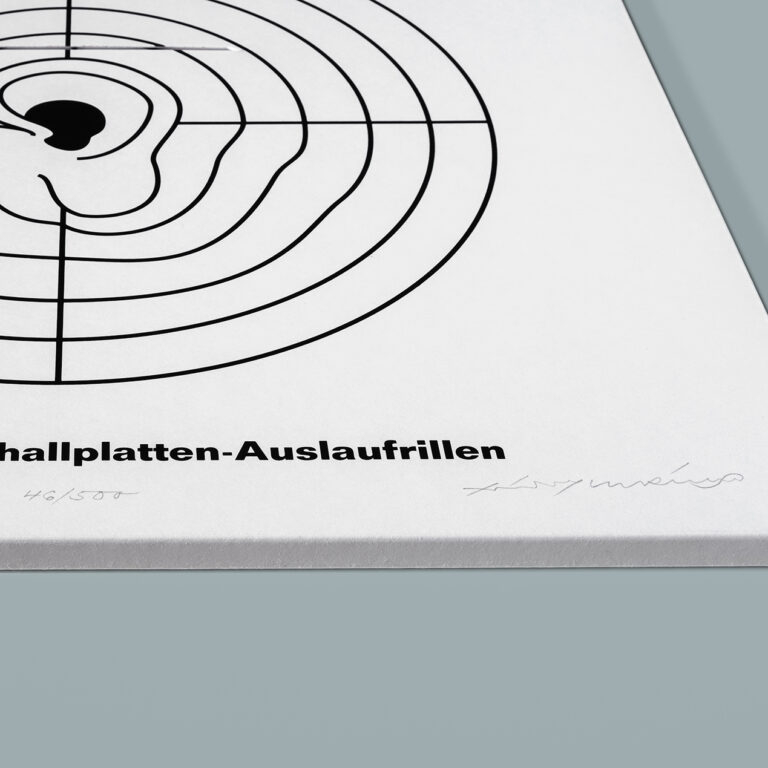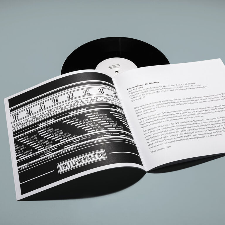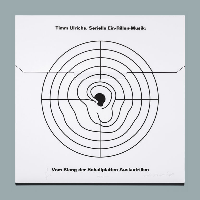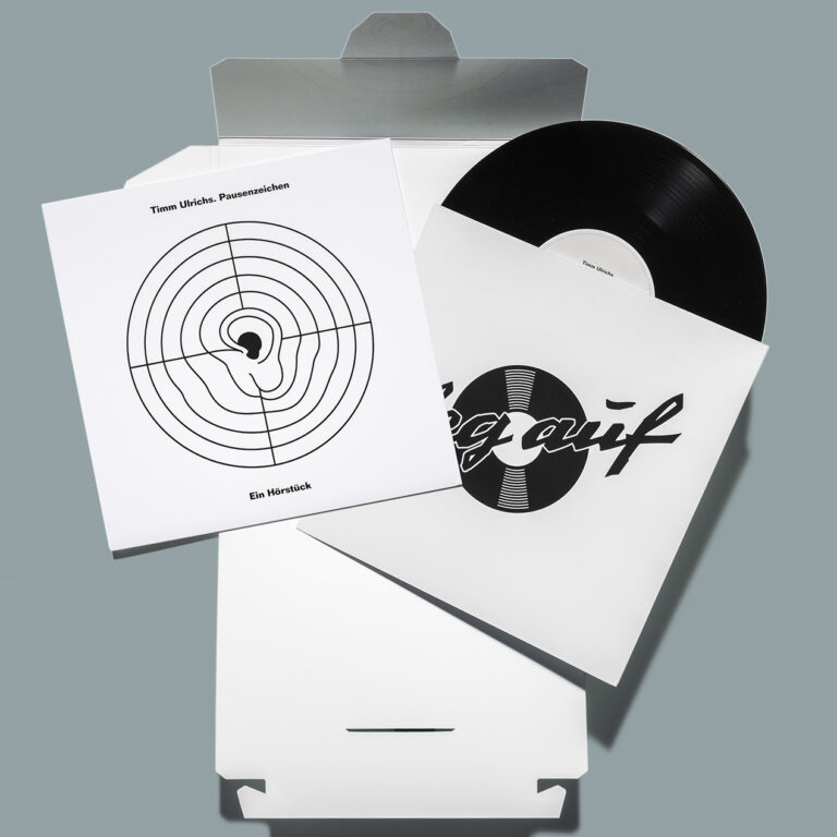 Based on an idea from 1969, Timm Ulrichs produced his “Pausenzeichen-Komposition” 1989 as part of the project “Zeit-Radio-Zeit” of the Steirische Kulturinitiative Graz (Styrian Cultural Initiative Graz). This is a compilation of the characteristic melodies of the radio stations, which sound as pause fillers. Ulrichs has compiled 24 of these signations (a neologism from the ORF) of radio stations from 15 states in such a way that they form and interfere with a kind of acoustic scale and can correspond with each other. The acoustic break rooms here become the concert of an international radio orchestration. On the B-side: Ulrichs’ “Serial Ein-Rillen-Musik” (1963), premiered 1965, remastered 2018. Cover design by Johann Zambryski.