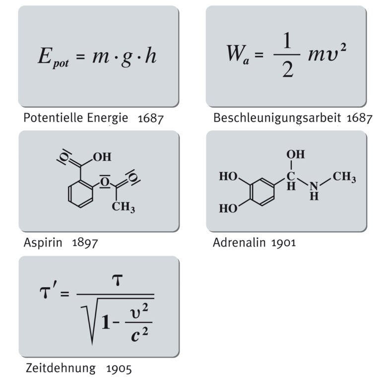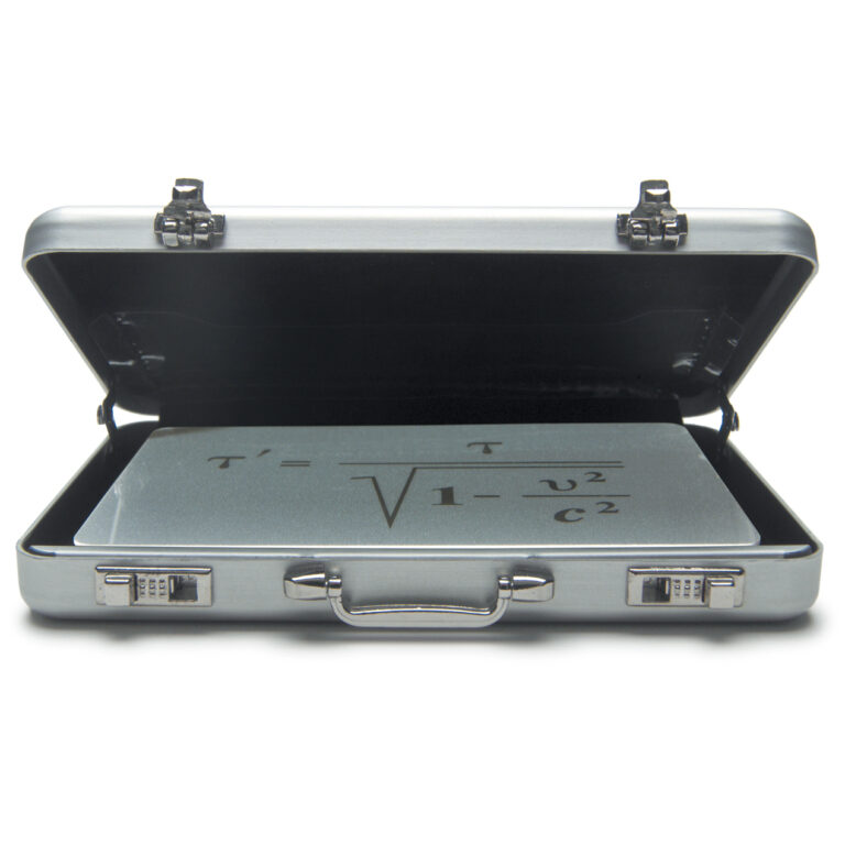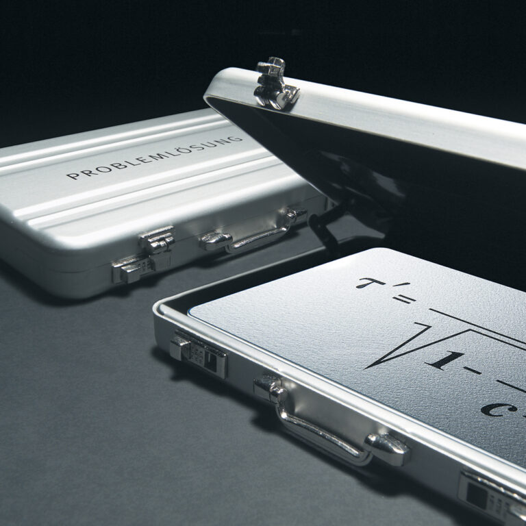 Motifs: Potential energy, nach 2. Newton’schen Axiom, 1687; Speed work (Beschleunigungsarbeit), 2nd Newton’s Axiom, 1687; Aspirin, Felix Hoffmann, 1897; Adrenaline, Jokichi Takamine, 1901; Time dilation (Zeitdehnung), Albert Einstein, 1905. Solutions of elementary problems are expressed in formulas, which Ottmar Hörl produced in large format screen printings on aluminum, 1999. In this edition formula images printed on silver plastic cards, inserted in an aluminum card case.