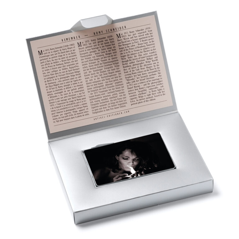 Romy Schneider in her Paris apartment in 1973, photographed by Helga Kneidl. The photograph were reproduced from a baryt paper print of a black and white 35 mm negative in four-colour foil printing (with duotone effect).