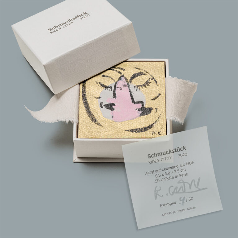 “Moon Faces” are part of Kiddy Citny’s iconographic canon of works alongside his “Herzgesichter” (heart-shaped faces) and “Princes”. The androgynous profiles, which when juxtaposed as a whole form the full moon, reflect the concept of the moon, which oscillates between male and female. On Peter- chen’s “Journey To The Moon”, the (Germanic) “Man In The Moon” is a monster. Paul Lincke replaces the Man in his operetta with the merry widow Luna. With the Chinese the “male” moon is the woman Chang’e. The ancient Greeks idolized the earth satellite as Selene, the Romans personified it as the (female) Luna. In Kiddy Citny’s moon motif we see his wish that we incline towards each other in harmony, as the man in the moon merges into unity with La Luna.