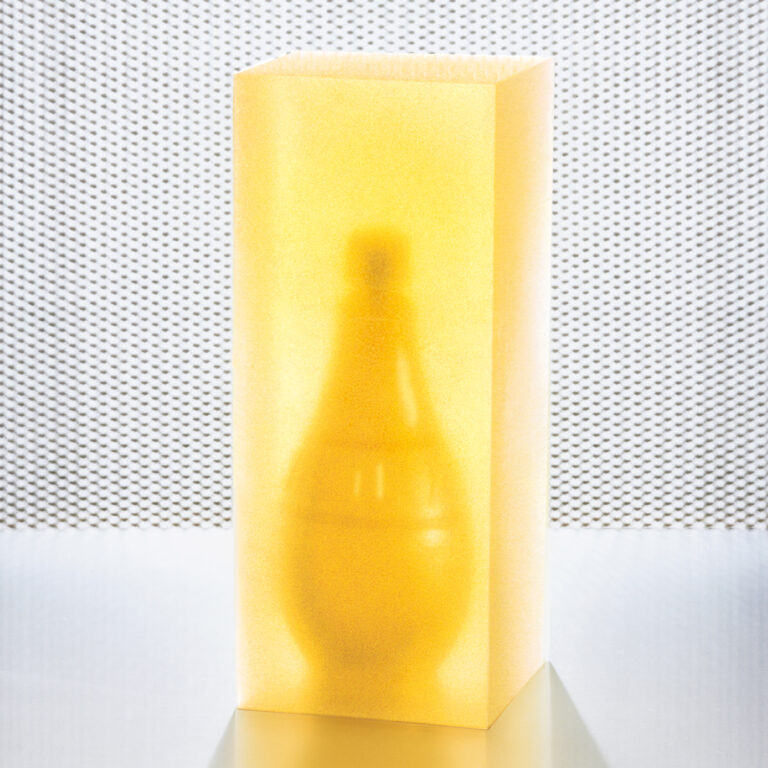 Plastic bottle (liquid lemon brand „Sizilia“), casted in synthetic resin, polished, sandblasted, 15 x 6.5 x 6.5 cm; edition of 100, sign./num. (engraved)