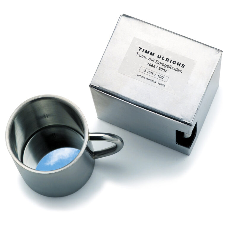 Die Tasse besteht aus rostfreiem, außen poliertem Edelstahl. In den Tassenboden (Innen) eingelassen ist ein Kristallspiegel (zur narzistischen Selbstbeschau). Editionsetikett mit Handsignatur und Exemplarnummer auf dem äußeren Tassenboden (gelieferte Exemplarnummer abweichend von Abbildung).