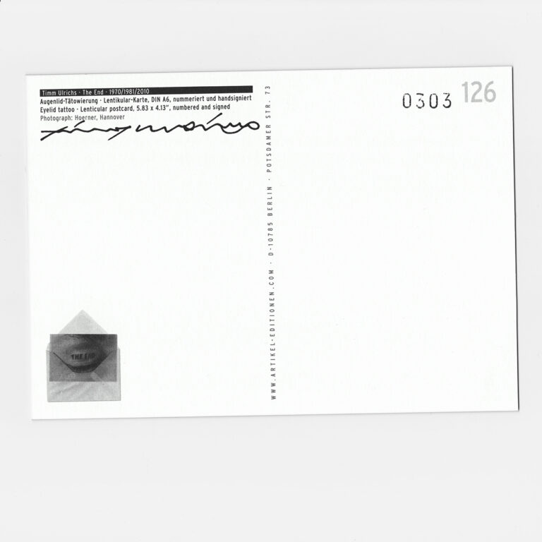 1981 ließ sich Timm Ulrichs im Frankfurter Samy’s Tattoo Studio den Schriftzug THE END auf sein rechtes Augenlid tätowieren. Das von Foto-Hierner dokumentierte Motiv ist 2010 als Lentikularkarte erschienen. „THE END“ ist auch der Titel einer Videoarbeit, die 60 Schlußbilder aus Spielfilmen in einer ca. siebenminütigen Anthologie versammelt.