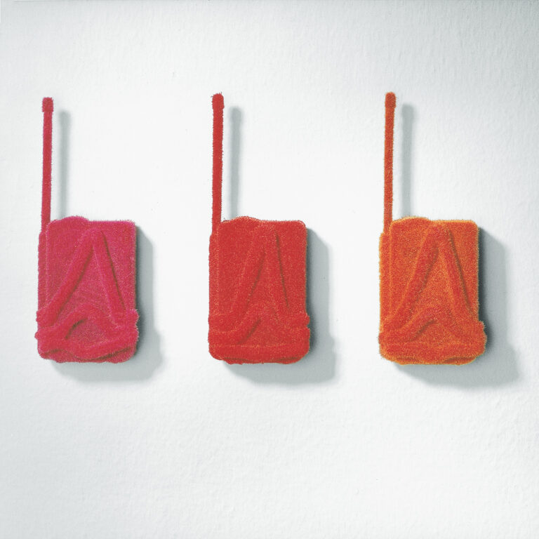A Multiple from Barbara Szüts’ work group “Modules”, in which she compresses physical waves into contemporary epigrams. The objects can be read as Pop Art readymades from the early days of the popularity of mobile phones and data carriers, alongside such classic consumer electronics products as light bulbs and portable transistor radios.