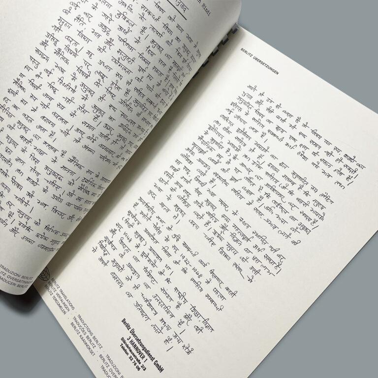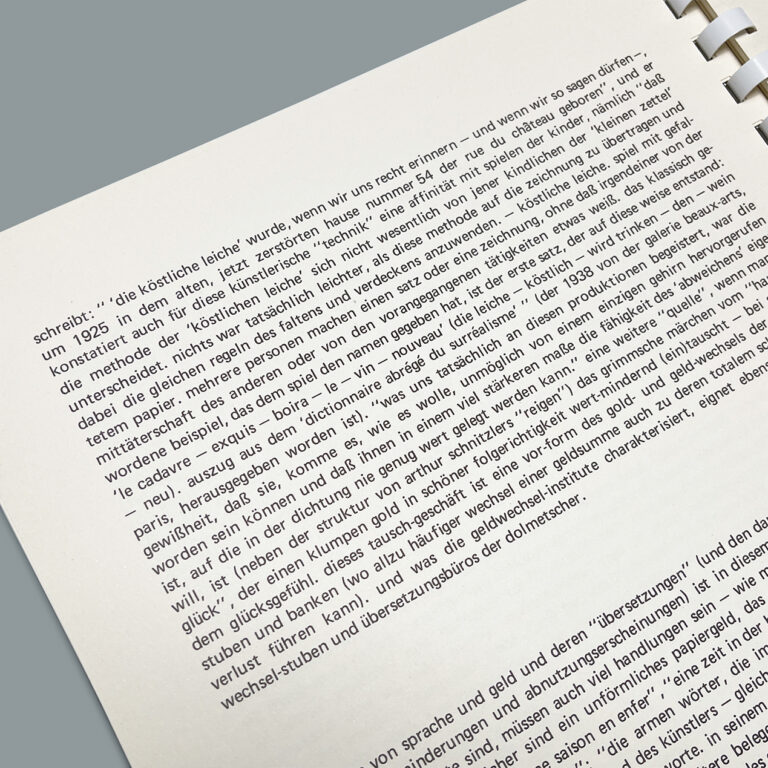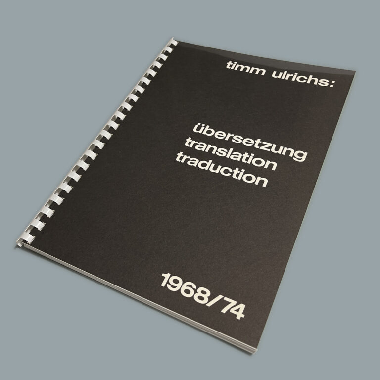 In this work, conceived in 1968 and realised in 1974, Timm Ulrichs has a German text translated into 24 foreign languages by sworn translators, with each translation being translated into the next language by the following translator, unaware of the German source text, before the 25th translation (from Hindi) is retranslated into German. The “language cycle” goes once around the world – from the Romance to the Slavic and Semitic languages to Chinese and Japanese and back to German. T.U. uses the lexical definition of the term “Übersetzung” from the 1957 edition of the Großer Brockhaus as the source text. The language game corresponds to the “Chinese Whispers” scheme, in which a spoken sentence becomes completely devoid of meaning in the course of the communication chain – comparable to the devaluation of a sum of money after many exchanges into other currencies (as in T.U.’s parallel series of experiments “Money/Exchange/Money”).