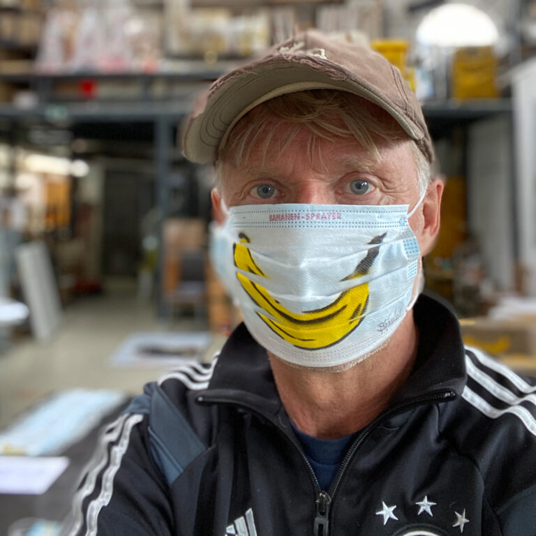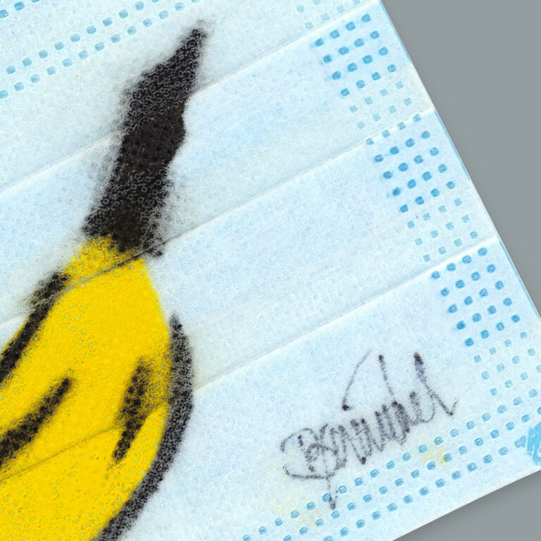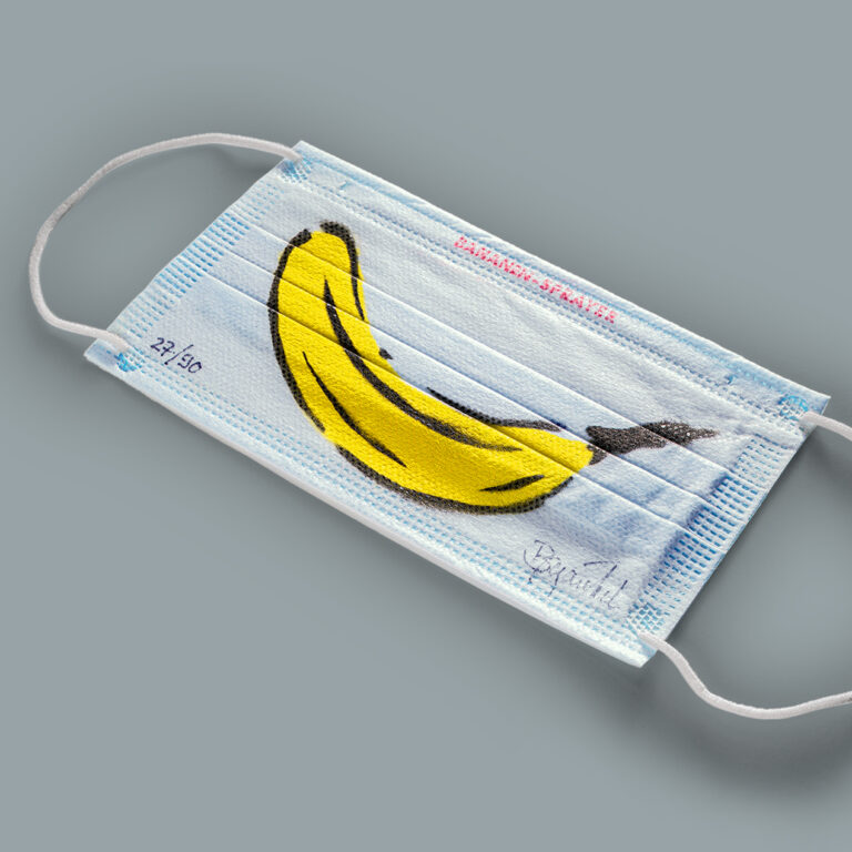 Für coronaphobe oder -phile Kunstsammler gibt es jetzt die „Bananenmaske“ von Thomas Baumgärtel. Der seit Mitte der 1980er Jahre als „Bananensprayer“ berühmt-berüchtigte Künstler hat Mund-Nasen-Schutzmasken mit seinem typischen Schablonengraffitio versehen. Dieses prangt mittlerweile an über 4000 Galerie- und Museumsportalen in zwölf Ländern. In seiner Pochoir-Technik wird das Motiv maskiert, bevor es auf Fassaden, Leinwände oder aktuell auf „Coronamasken“ gesprüht wird.