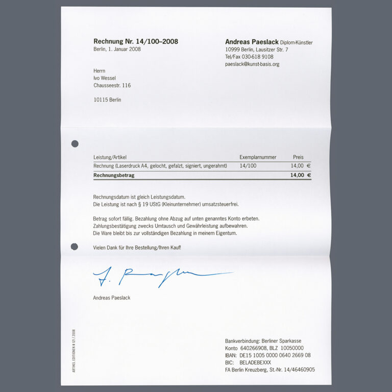Dieses Multiple realisiert die hundertprozentige Kongruenz von bildender Kunst und ihrem Verkauf in Form einer Rechnung (für die „Rechnung“). Die Verkaufspreise (Rechnungspreise) identifizieren sich über die Exemplarnummer (= Rechnungsnummer) der limiterten Edition. Die berechenbare Zufälligkeit bzw. intendierte Beliebigkeit der Auspreisung dieser Kunstwerke (Rechnungen) korrespondiert mit der Bewertungspraxis im Kunstmarkt, in dem Kunst-Produkte einem ständigen Wertewandel ausgeliefert sind.