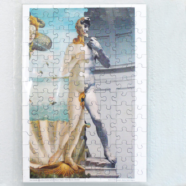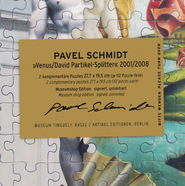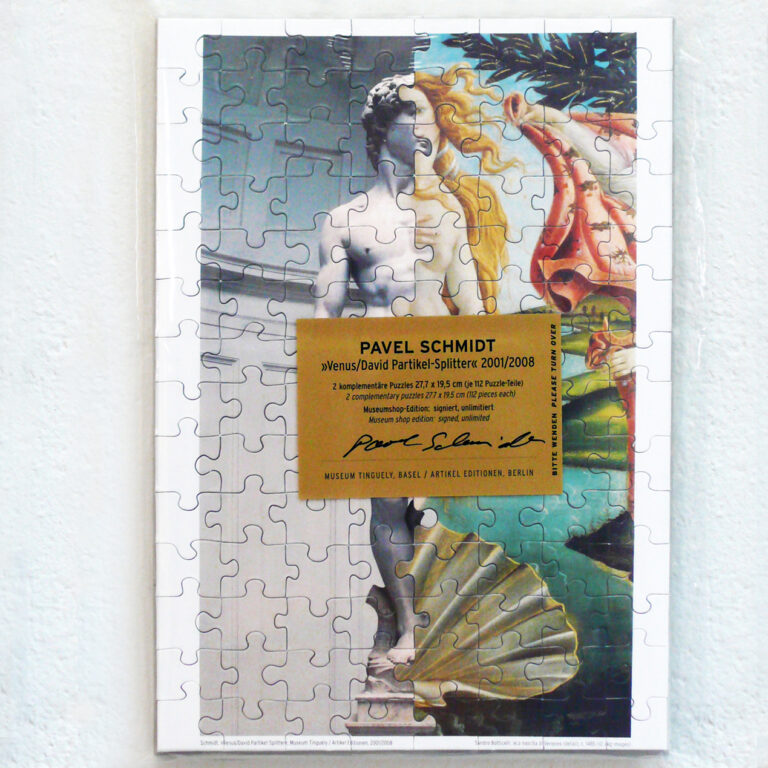 Botticellis Venus und Michelangelos David spielen in Pavel Schmidts Aktionen eine Hauptrolle. In komplementären Montagen dieses Traumpaares der Kunstgeschichte, in Sprengungen und Zusammensetzungen, in Verstrickungen mit Rot- und Weissweinschläuchen macht er deren Vermählung zu bildnerischen Ereignissen. Den Prototyp zur vorliegenden Puzzle-Edition montierte Schmidt 2001 aus zwei gekauften »Venus«- und »David«-Puzzles. Das Multiple ist anlässlich der Ausstellung „p.s. Pavel Schmidt“ im Museum Tinguely, Basel (2008) erschienen.