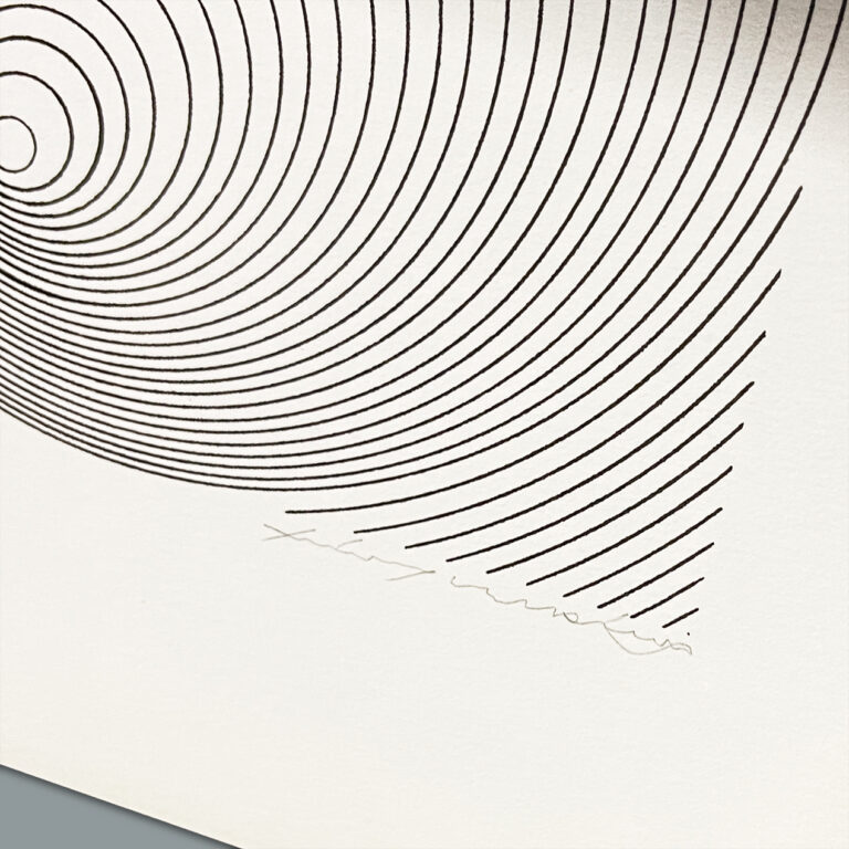 Timm Ulrichs created the “Visual Constructions” during his architectural studies at the Technical University of Hanover (1959-66) – with Pelikan Graphos 0.4 mm and compass on Schoellerhammer 6R. This is one of seven motifs that appeared as silkscreen prints in Edition H in 1967/68. The work group stands at the beginning of Ulrichs’s artistic œuvre, which is anchored in Concrete Art and Poetry. In 2018, the remaining stock of the second edition 1968 from the estate of August Haseke (edition h) went to Artikel Editionen.