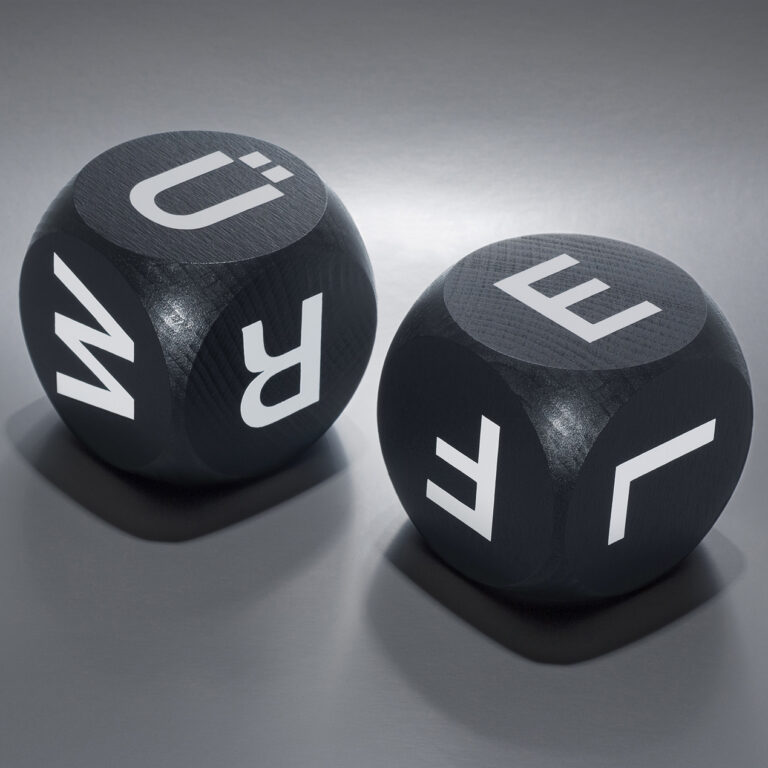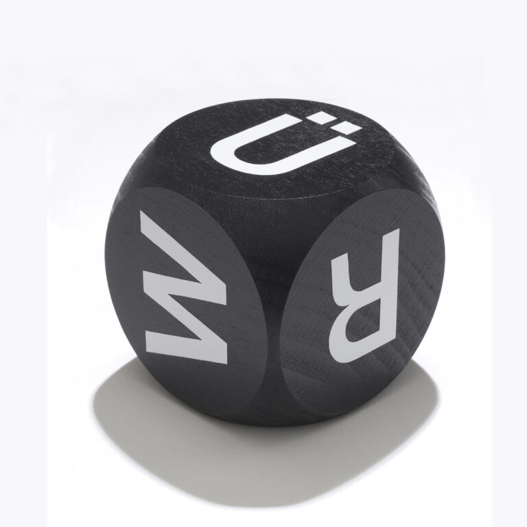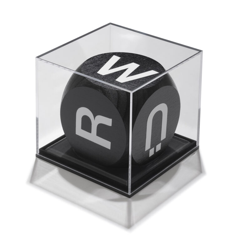 Im Umfeld der Gruppe um Prof. Max Bense von der TU Stuttgart beschäftigt sich Timm Ulrichs mit Konkreter Poesie und erfindet 1964 das „dreidimensionale Wort“ in Form des sechsseitig mit den sechs Lettern „W/Ü/R/F/E/L“ bedruckten Acrylwürfels. 43 Jahre später erscheint sein „WÜRFEL“ komplementär in Schwarz mit weiß aufgedruckten Lettern als limitierte Sammlerausgabe.