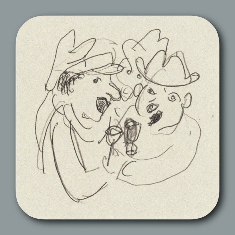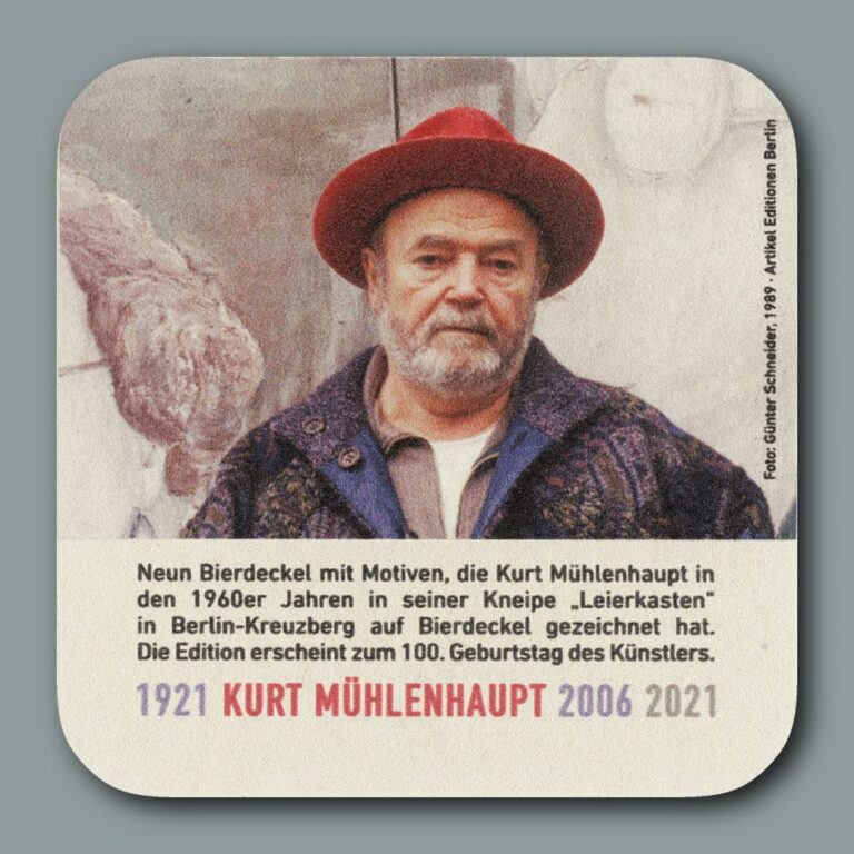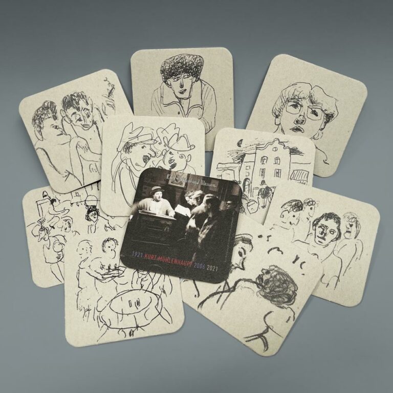 Kurt Mühlenhaupt drawing on the backs of beer mats in his pub “Leierkasten” in Berlin-Kreuzberg in the 1960s. Edition for the artist’s 100th birthday for the Kurt Mühlenhaupt Museum, Berlin.