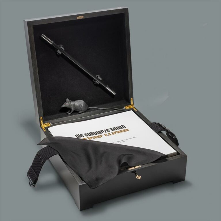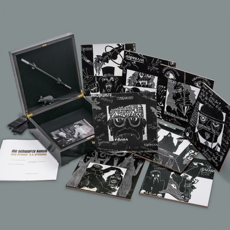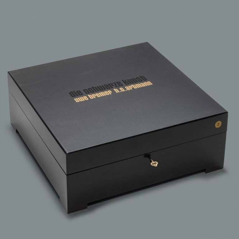 1978 schreibt H. C. Artmann „sieben Mitteilungen zur schwarzen Kunst“ von Uwe Bremer. Damals erschienen in einer auf 90 Exemplare limitierten, von der Hamburger Galerie Brockstedt herausgegebenen Grafikmappe mit sieben Farbradierungen ist dieser Text des österreichischen Schriftstellers bis heute weithin unbekannt. 2021, im Jahr von Artmanns hundertsten Geburtstag, würdigt Bremer seinen im Jahr 2000 verstorbenen Freund mit einem neuen Portrait und interpretiert dessen Text aus 1978 in sieben neuen Holzschnitten – versammelt in einer „Zauberbox“ mit textzitierenden Utensilien.